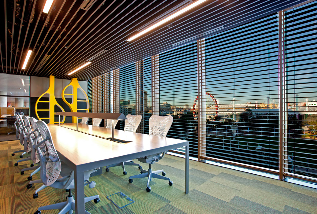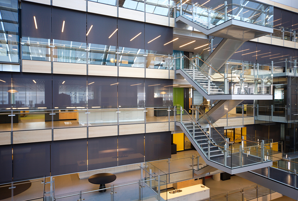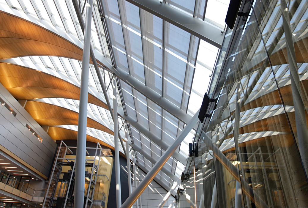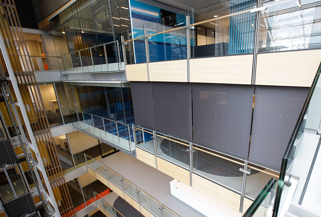 Horiso installed three solar control systems, integrated with motorised control to effectively manage the buildings’ requirements. Horiso Speciality Timber Blinds were selected for the western facade and installed internally. A unique tension blind system was developed for the atrium skylight ceilings and roller blinds were designed for the central atrium perimeter areas. In total, 25,000 linear metres of timber venetian blinds were installed on the western side of the two building facades. The blind sections are sychronised and automatically tilt in response to the exact position of the sun throughout the day. This Horiso control system is based on an intelligent motor controller pre-programmed with other building control requirements - including both the geographical location and physical orientation of the building’s curved design. It operates in conjunction with sun-tracking software that enables individual blinds to react to the variations of the sun’s angle throughout the year.